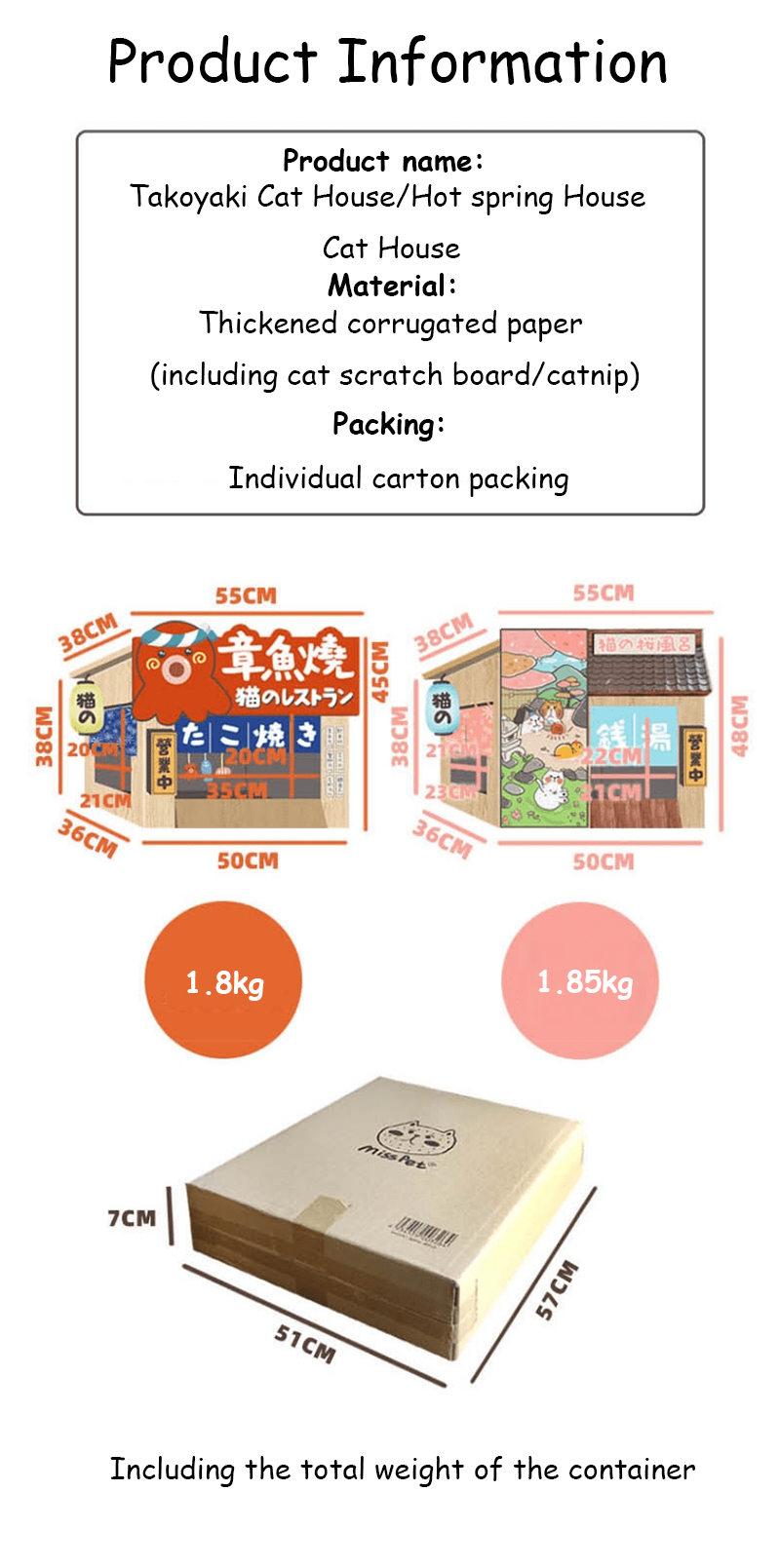 🐙 Japanisch inspiriertes Design: Das Katzenkratzbrett Takoyaki House Hot Spring House verfügt über ein charmantes und bezauberndes Design, das an ein traditionelles japanisches Takoyaki-Haus erinnert. Es verleiht dem Spielbereich Ihrer Katze einen Hauch japanischen Flairs.